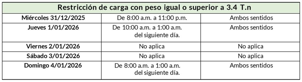 Por lo anterior, el Concesionario incrementará el personal en las estaciones de peaje y fortalecerá las unidades de inspectoria vial, carro-talleres, ambulancias, grúas, así como los equipos de rescate y atención de accidentes. Asimismo, mantendrá disponibles las 24 horas los equipos y la maquinaria amarilla necesarios para responder oportunamente ante cualquier eventualidad que pueda presentarse. De igual manera, se realizarán operativos de control a lo largo del corredor por parte de la DITRA, enfocados en las infracciones más recurrentes, tales como exceso de velocidad, adelantamiento en sitio prohibido y verificación de SOAT y revisión técnico-mecánica, entre otros.